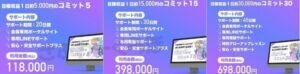初期費用のあとにはきっちりと高額なバックエンドプランが用意されており、サポートを受けるためには12万円から130万円までのプランに入る必要があります。