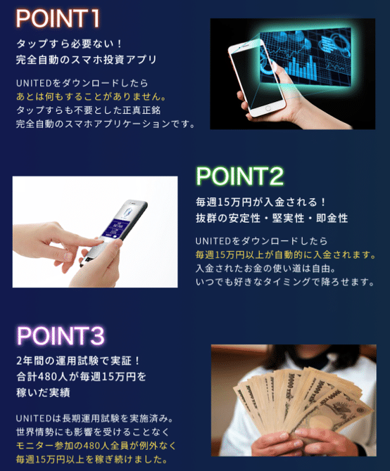 ユナイテッド(UNITED)とは3つの投資ジャンルを統合させた世界初の融合資産構築アプリとのことです。