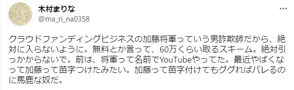 - 加藤将軍は詐欺師と評判や口コミが多い人物