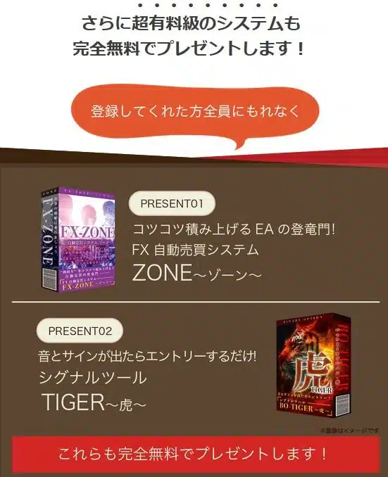 これに加えて、FX自動売買システムZONE~ゾーン~やシグナルツールTIGER~虎~といった有料級のツールが贈られるようですが、登録後に正確な内容が教えられます。