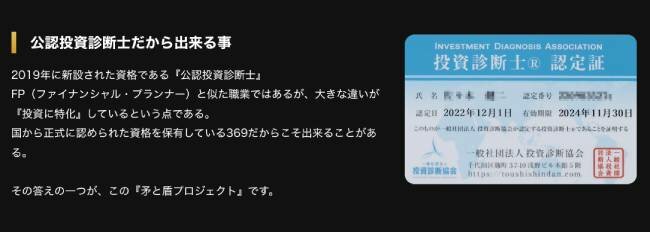 また、彼のプロジェクトは公認投資診断士としての能力によって成り立っているとされています。