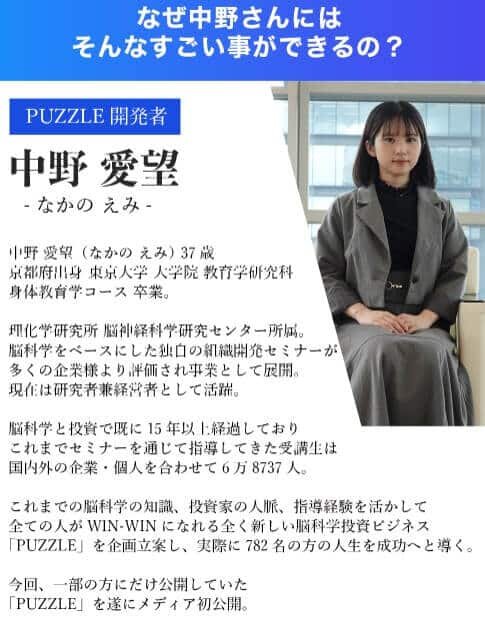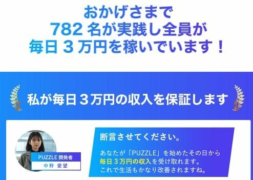 中野愛望のPUZZLE(パズル)は、副業として人々に毎日3万円の利益を保証するという脳科学に基づいた即金ビジネスとのことですが、一体どのようなものなのでしょうか?