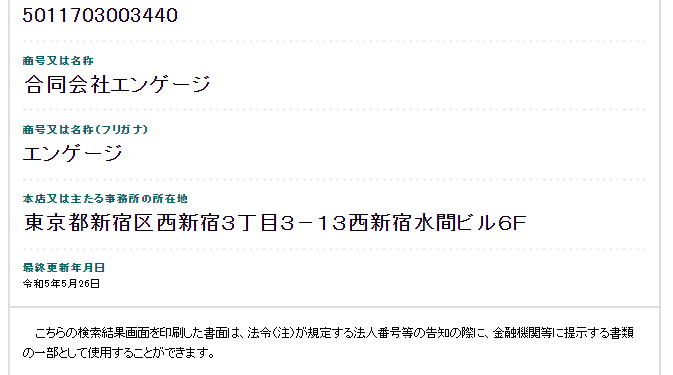 確認のために、国税庁の法人番号公式サイトで中山卓也の合同会社エンゲージを検索しました。