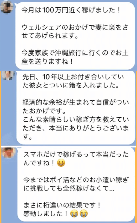 ウェルシェア(WEALSHARE)の公式サイトでは、複数の人からの感想がLINEの形式で掲載されていますが、具体的な作業内容やメリット・デメリットについての情報はありませんでした。