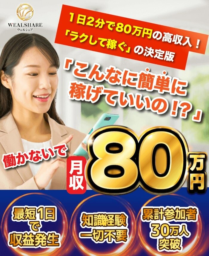 ウェルシェア(WEALSHARE)は、日本初の稼ぎ方である高収入の副業オファーとのこと。