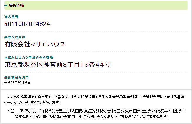 国税庁の法人番号公表サイトで確認したところ、有限会社マリアハウスは正規に法人として登録されています。
