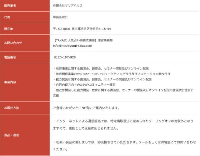 「ほしよみ式占い師養成講座」の特商法の表記から、運営元は有限会社マリアハウスであることが判明しました。