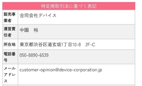 合同会社デバイスの特商法の表記では、会社情報に関する記載があります。