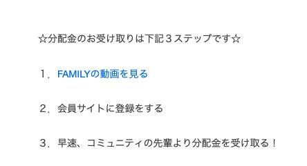 ここでわかったことがあるのですが、どうやらFAMILY(ファミリー)で分配金を手にするためには、送られてくる動画を視聴して登録をしないといけないとのこと。