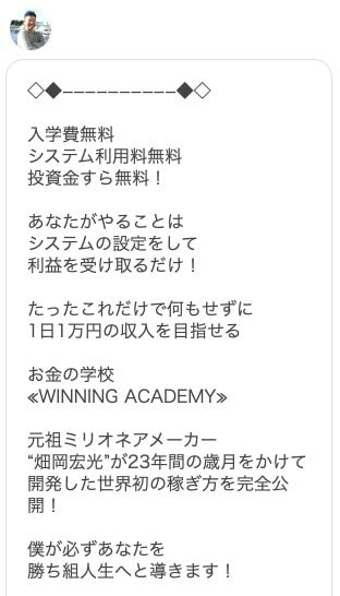 WINNING ACADEMY(ウイニングアカデミー)とは、あの悪評だらけの畑岡宏光が主催をしている副業でして、なんとシステムを受け取るのみで毎日1万円受け取れるという意味不明なもの。