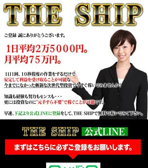 THE SHIP,(ザシップ)とは、どうやら最先端の指導投資のシステムを導入しているらしく、その稼ぎはなんと!毎月75万円…しかも不労収入という形で得れるというもの笑