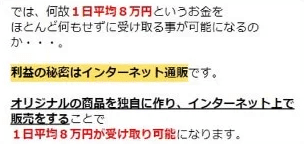 で、肝心の毎日8万円儲かる理由に関してですが、何やらオリジナルの商品を作成しネットで販売することで8万円稼げるということらしい。