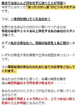実践する人は、特に何もせずに社長のようにただただ椅子に座っているのみでなんと月収240万円を目指せるんだとかw