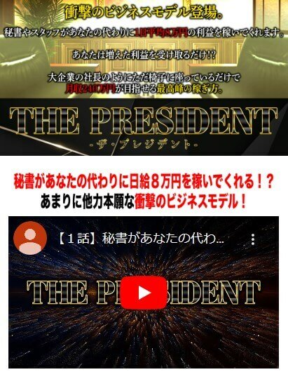 今回のザ・プレジデント,(THE PRESIDENT)という案件は、「最強の秘書軍団があなたの代わりに毎日8万円稼いでくれる」という、ポンコツすぎて笑いが止まらないレベルの案件になります。
