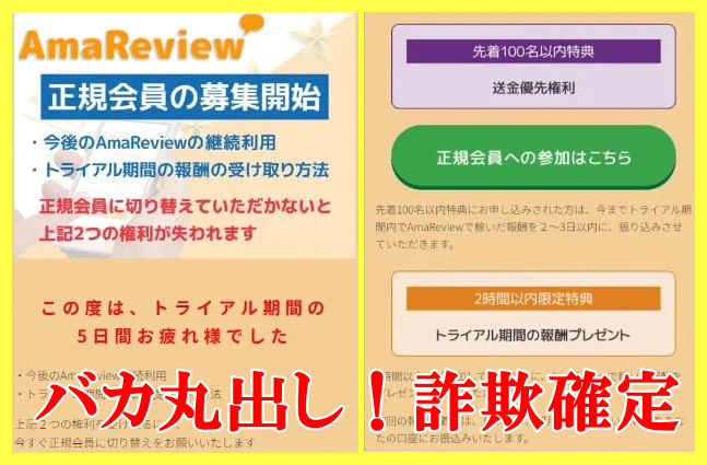 ここで、正規会員にならないとトライアル期間に得たお金を引き出せないから参加費を払えと急かされます。