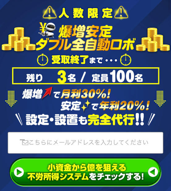 そんな爆増安定W全自動ロボ,(田中ひろたか)の案件ですが、人数を限定して集めているようで100名限定とのことでした。