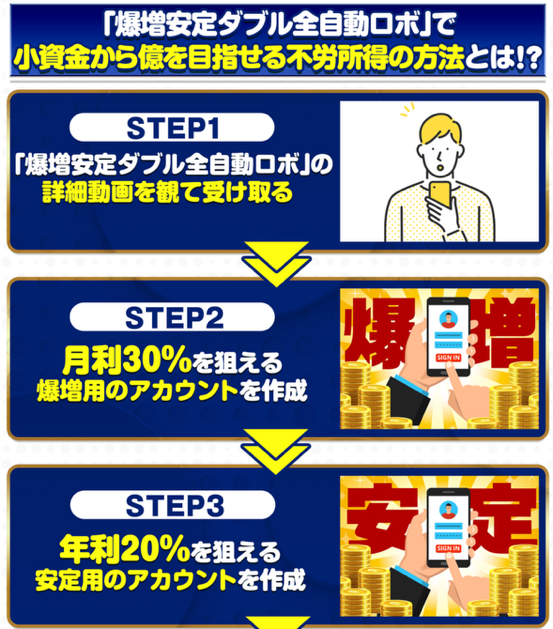 爆増安定W全自動ロボ,(田中ひろたか)とは、冒頭でもお伝えしましたが、作業としてやることといえば「スタートボタンを押すだけ」というママゴトのような事で、なんと月利20%~30%もの利回りを出すことが可能な投資案件とのこと。