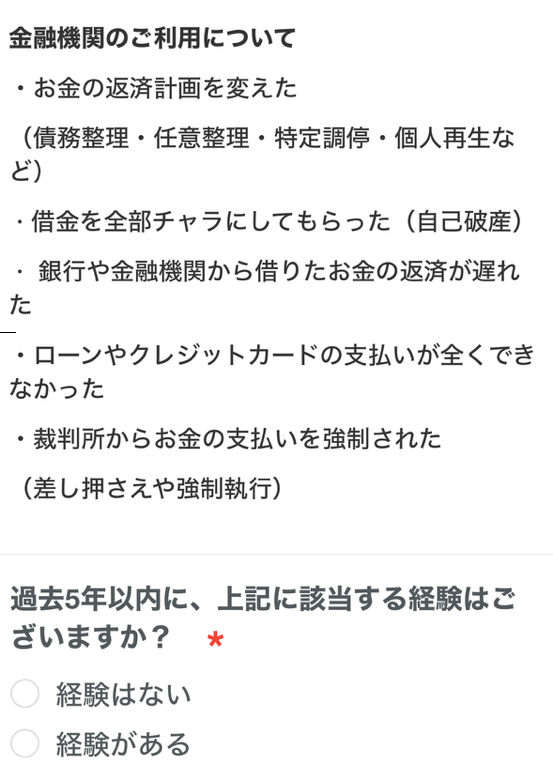 「過去5年以内に上記に該当する経験はあるのか?」という質問は、例えば債務整理などをした場合は信用情報機関に5年間はブラックとして情報が上がっている=5年以内の場合は借金をさせれない、ということで詳細に振るいにかけていますね汗