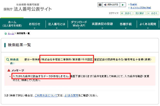 ただし、この株式会社手塚宏二事務所について、国税庁の法人番号公表サイトで確認を行ったところ、公に登録されていませんでした。