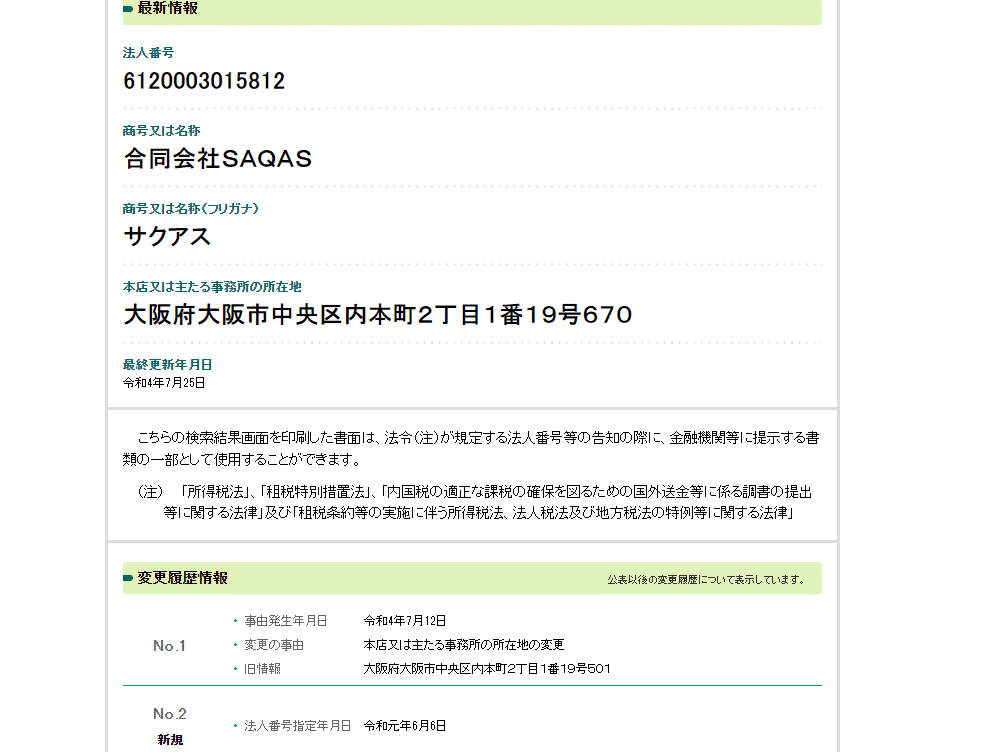国税庁の法人公表サイトでの検索の結果、合同会社SAQASは実際に存在している会社であることが確認できたのですが、なんと2年前に住所を変更したにも関わらず、特商法の表記は旧住所のままとなっています。