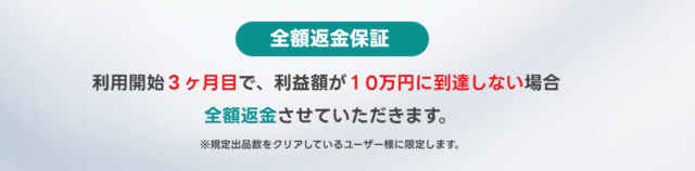 さらに彼らは、利用開始3か月目で利益額が10万円に到達しなかった場合には、全額返金保証するという宣伝もしています。