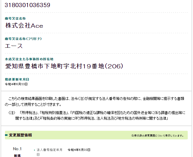 この会社について国税庁の法人番号公表サイトを調査しまして、確かに同社は登記を行っております。