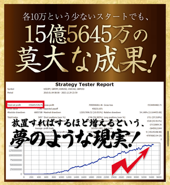 LPではバックテストの掲載が有り「15億5645万」だとか「7億6915万」など、常識外れの桁違いの成果が掲載されています。